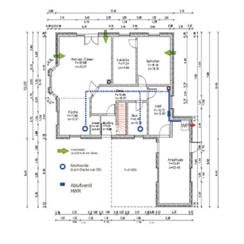 Die Luftbewegung in den Wohnräumen darf nicht als störend empfunden werden. Dunstabzugshauben in Küchen und Abluftwäschetrocknern dürfen nicht an das Wohnungslüftungsgerät angeschlossen werden. Bei einer vorhandenen Feuerstätte (z.B. Kamin, Kachelofen) muss der zuständige Schornsteinfeger bei der Anlagenplanung einbezogen werden. Für die Anlagenplanung wird die Grundrisszeichnung des Hauses mit den lichten Geschosshöhen und der geplanten Raumnutzung benötigt.